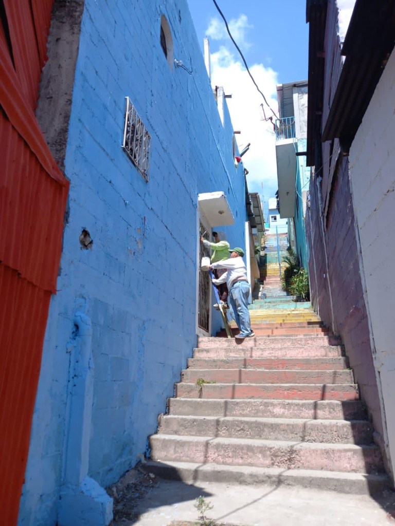 Trabajadores de la Municipalidad de Mixco pintan las casas del barrio El Cenicero. / Foto: Facebook Neto Bran
