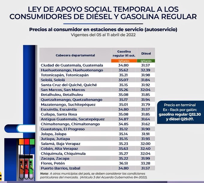 Este martes entra en vigencia el subsidio a la gasolina regular y diésel en todo el país. El tipo regular tiene una rebaja de Q2.50 quetzales y en diésel Q.5.00 quetzales. El subsidio no aplicará para la gasolina tipo superior o más conocida como súper.